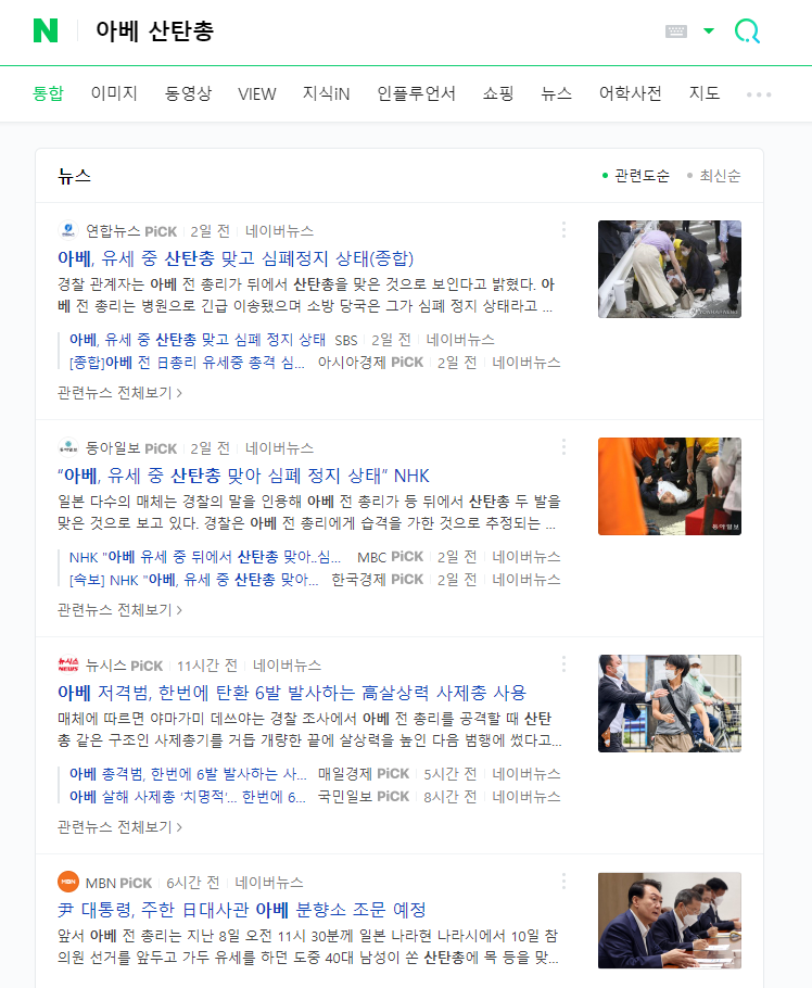 여튼 오늘 일본 전총리 사망소식과