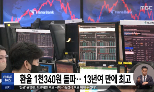 원달러 환율이 13년 4개월 만에 장중 1,340원을 돌파했습니다. 오늘 서울 외환시장에서 달러 대비 원화 환율은 전 거래일 종가보다 13.9원 오른 1,339.8원에 마감했습니다...