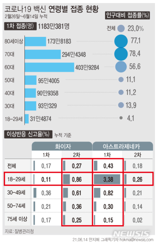 이 기준은 백신이 우리나라에도 유통된 올 초부터 중반까지의 연령별 백신접종률이고